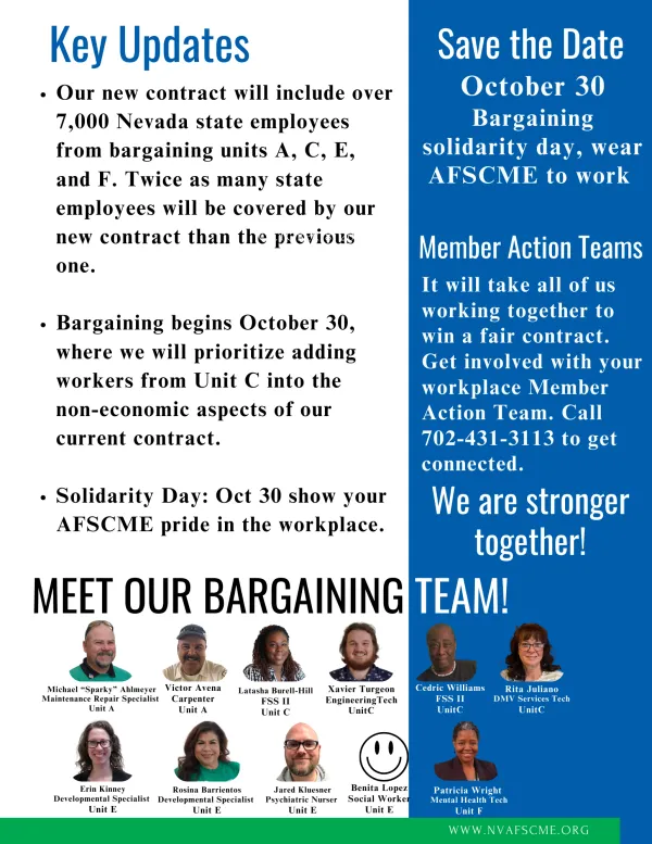 News AFSCME Bargaining Bulletin - October 8 Cyndy Hernandez Oct. 10, 2024 Social share icons What do you want to see in our next contract? Click here to fill out your bargaining survey!
